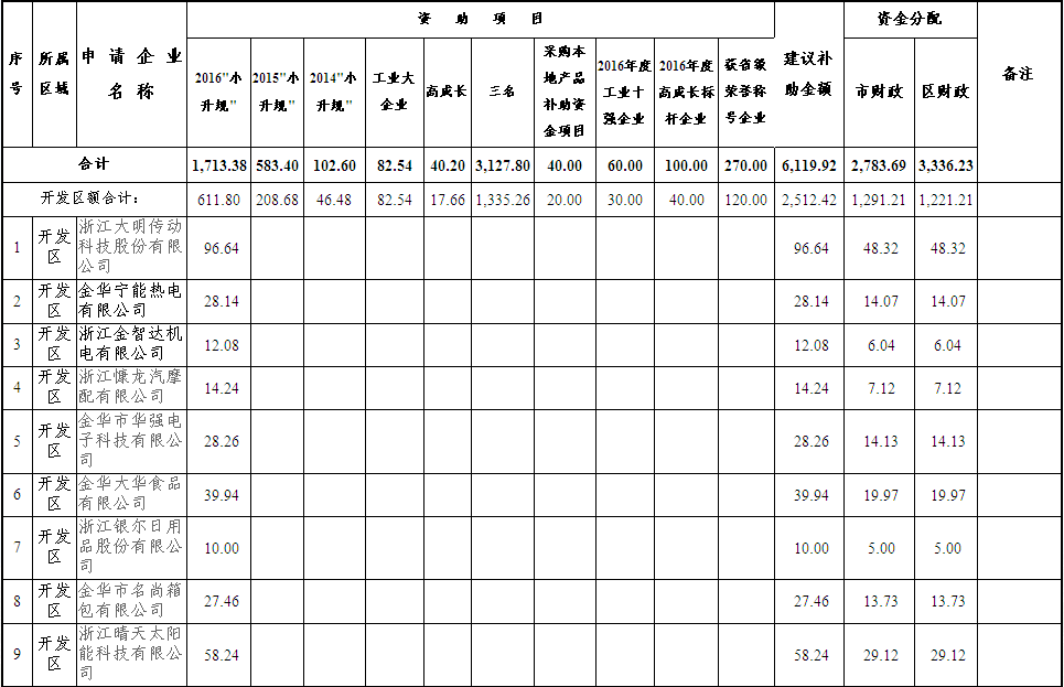根據(jù)金華市人民政府《關(guān)于進(jìn)一步降低企業(yè)成本減輕企業(yè)負(fù)擔(dān)的若干意見》(金政發(fā)〔2016〕25號(hào))、《關(guān)于加快培育現(xiàn)代產(chǎn)業(yè)體系打造先進(jìn)制造業(yè)基地的通知》(金政發(fā)〔2016〕40號(hào))、《關(guān)于全面推進(jìn)“三名”工程的實(shí)施意見》(金政發(fā)〔2014〕42號(hào)),金華市人民政府辦公室《關(guān)于培育發(fā)展市區(qū)工業(yè)大企業(yè)大集團(tuán)的實(shí)施意見》(金政辦發(fā)〔2014〕7號(hào))、《關(guān)于印發(fā)金華市區(qū)高成長(zhǎng)企業(yè)培育辦法通知》(金政辦發(fā)〔2014〕6號(hào))、《關(guān)于支持小微工業(yè)企業(yè)規(guī)范升級(jí)的若干意見》(金政辦發(fā)〔2013〕40號(hào))、《關(guān)于促進(jìn)小型微型企業(yè)再創(chuàng)新優(yōu)勢(shì)的通知》(金政辦發(fā)〔2012〕79號(hào))等文件精神,市經(jīng)信部門及時(shí)下發(fā)通知,組織企業(yè)申報(bào),經(jīng)過企業(yè)申報(bào)、各區(qū)初審和金華君安會(huì)計(jì)事務(wù)所審計(jì),現(xiàn)將2016年度市區(qū)小升規(guī)企業(yè)、工業(yè)大企業(yè)大集團(tuán)、高成長(zhǎng)企業(yè)、“三名”培育試點(diǎn)企業(yè)、采購(gòu)本地產(chǎn)品項(xiàng)目、工業(yè)十強(qiáng)企業(yè)、高成長(zhǎng)標(biāo)桿企業(yè)、獲省級(jí)榮譽(yù)稱號(hào)企業(yè)等財(cái)政補(bǔ)助資金予以公示,公示期:2017年10月21日—10月27日,聯(lián)系人:鄭海員;聯(lián)系電話:82463730。