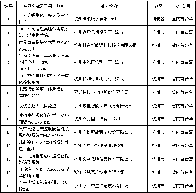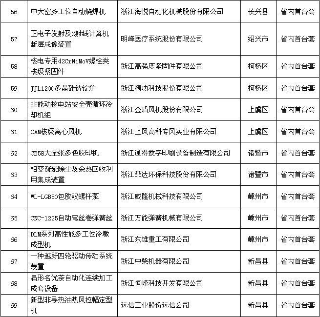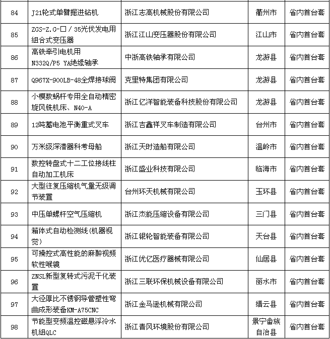 2018年度浙江省裝備制造業(yè)重點領(lǐng)域首臺(套)產(chǎn)品認定結(jié)果公示名單