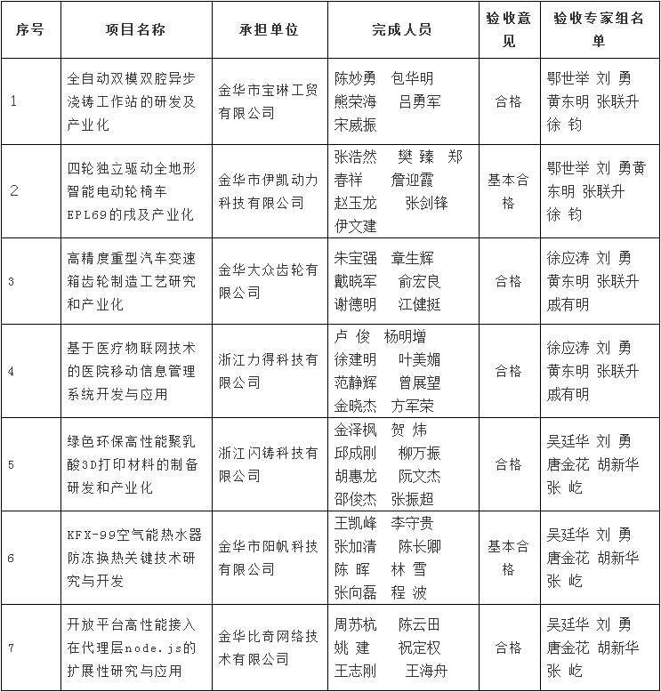 根據《金華市級科技計劃項目驗收管理辦法》(金市科字〔2015〕83號)規定,現將金華市寶琳工貿有限公司、金華市伊凱動力科技有限公司、金華大眾齒輪有限公司、浙江力得科技有限公司、浙江閃鑄科技有限公司、金華市陽帆科技有限公司、金華比奇網絡技術有限公司承擔的《全自動雙模雙腔異步澆鑄工作站的研發及產業化》、《四輪獨立驅動全地形智能電動輪椅車EPL69的戌及產業化》、《高精度重型汽車變速箱齒輪制造工藝研究和產業化》、《基于醫療物聯網技術的醫院移動信息管理系統開發與應用》、《綠色環保高性能聚乳酸3D打印材料的制備研發和產業化》、《KFX-99空氣能熱水器防凍換熱關鍵技術研究與開發》、《開放平臺高性能接入在代理層node.js的擴展性研究與應用》7個市級科技計劃項目驗收結果予以公示,接受社會監督,公示期從2018年6月21日至6月28日止。