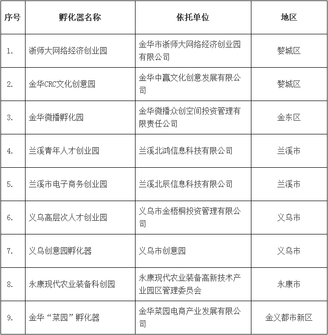2018年第一批金華市科技孵化器名單