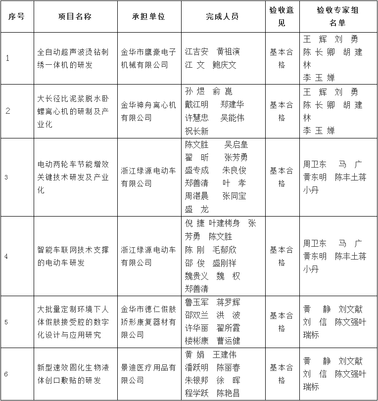 根據(jù)《金華市級科技計劃項目驗收管理辦法》(金市科字〔2015〕83號)規(guī)定,現(xiàn)將金華市鷹豪電子機械有限公司、金華神舟離心機有限公司、浙江綠源電動車有限公司、金華市德仁假肢矯形康復器材有限公司、金華市景迪醫(yī)療用品有限公司承擔的《全自動超聲波燙鉆刺繡一體機的研發(fā)》、《大長徑比泥漿脫水臥螺離心機的研制及產(chǎn)業(yè)化》、《電動兩輪車節(jié)能增效關(guān)鍵技術(shù)研發(fā)及產(chǎn)業(yè)化、智能車聯(lián)網(wǎng)技術(shù)支撐的電動車研發(fā)》、《大批量定制環(huán)境下人體假肢接受腔的數(shù)字化設計與應用研究》、《新型速效固化生物液體創(chuàng)口敷貼的研發(fā)》5家企業(yè)6個市級科技計劃項目驗收結(jié)果予以公示,接受社會監(jiān)督,公示期從2018年7月16日至7月23日止。
