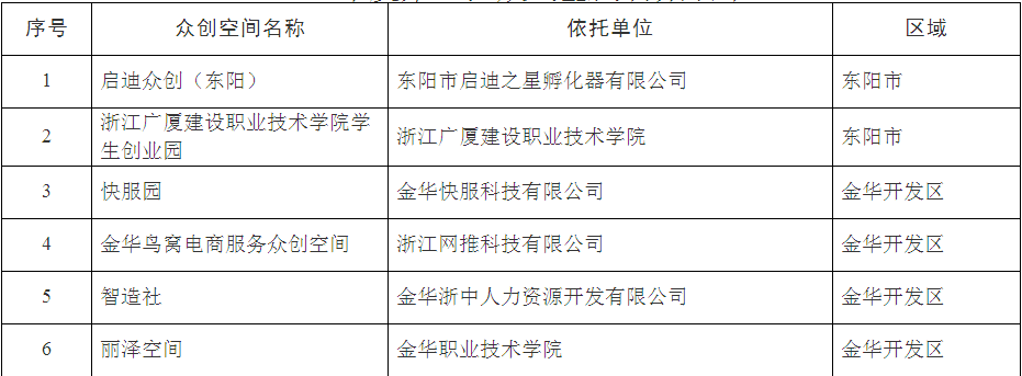 根據《金華市眾創空間管理辦法(試行)》(金市科〔2016〕70號)規定,經研究,同意啟迪眾創(東陽)等6家單位備案為金華市眾創空間。