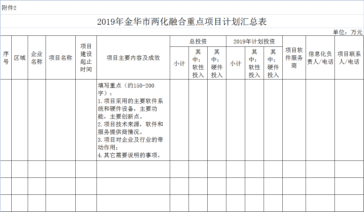 (三)請各地認真組織,動員企業積極申報。由申報企業按《金華市信息化和工業化融合重點項目管理辦法》要求填報《2019年金華市兩化融合重點項目申報表》(附件1)和《2019年金華市兩化融合重點項目計劃匯總表》(附件2),連同有關資料裝訂成冊(雙面打印);由各地經信部門匯總《2019年金華市兩化融合重點項目計劃匯總表》(附件2)。書面申報材料二份(另需提供電子文檔),于5月30日前報送我局。