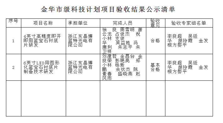 根據(jù)《金華市級(jí)科技計(jì)劃項(xiàng)目驗(yàn)收管理辦法》(金市科字〔2015〕83號(hào))規(guī)定,現(xiàn)將浙江東晶博藍(lán)特光電有限公司承擔(dān)的《4英寸高精度即開(kāi)即用藍(lán)寶石襯底片研發(fā)》和《6英寸LED用圖形化藍(lán)寶石襯底片制備技術(shù)研發(fā)》2個(gè)市級(jí)科技計(jì)劃項(xiàng)目驗(yàn)收結(jié)果予以公示,接受社會(huì)監(jiān)督,公示期從2017年7月31日至8月6日止。任何單位和個(gè)人對(duì)驗(yàn)收意見(jiàn)持有異議的,應(yīng)當(dāng)在公示期內(nèi)書(shū)面向市科技局提出異議,單位應(yīng)采用書(shū)面形式并加蓋公章,個(gè)人應(yīng)采用實(shí)名提出異議。